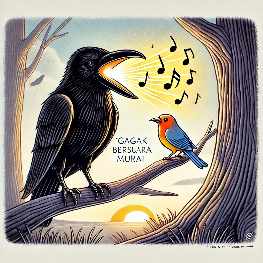 Betul sekali, “Gagak bersuara murai” adalah peribahasa yang mengandung ironi yang dalam. Gagak dikenal berwarna hitam dan suaranya serak, sedangkan murai identik dengan burung kecil yang bersuara merdu. Ketika seekor gagak “bersuara murai”, ia mengejutkan karena tampak tidak sepadan dengan ekspektasi visual kita.