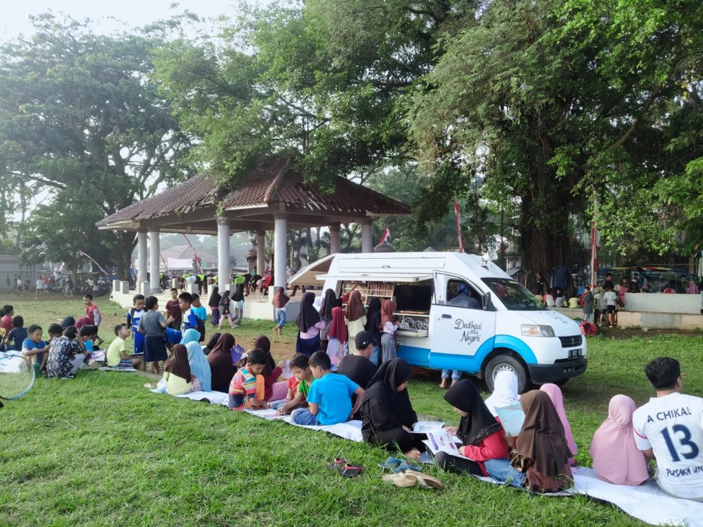 Perpustakaan keliling digelar pada pukul 06:33 WIB. Mobilnya nangkring berdekatan dengan ibu-ibu yang sedang senam aerobik. Rasa-rasanya membaca juga sedikit terganggu karena musiknya yang menggelar.