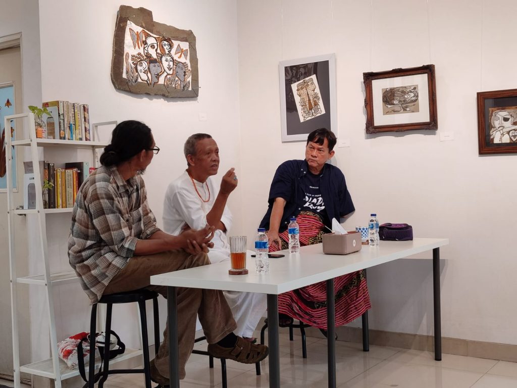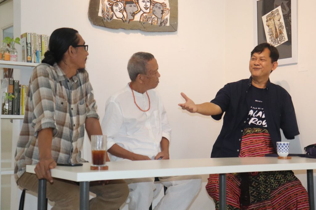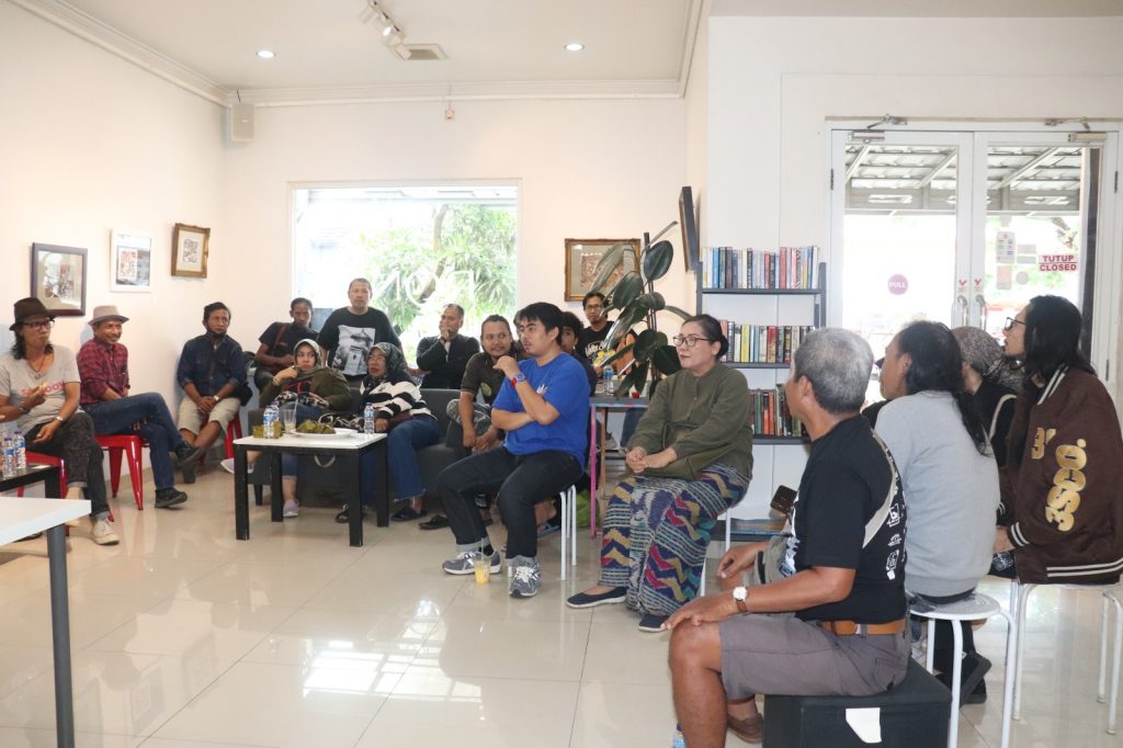 Sementara itu perupa Q’bro Pandam bercerita tentang proses kreatif Milu Mili exhibition. Ia mengatakan bahwa prosesnya mengalir saja, bersumber dari mengamati kehidupan sehari-hari. Ia berharap diskusi ini menggoda para perupa untuk membuat apapun dalam hal mengembangkan karya.
