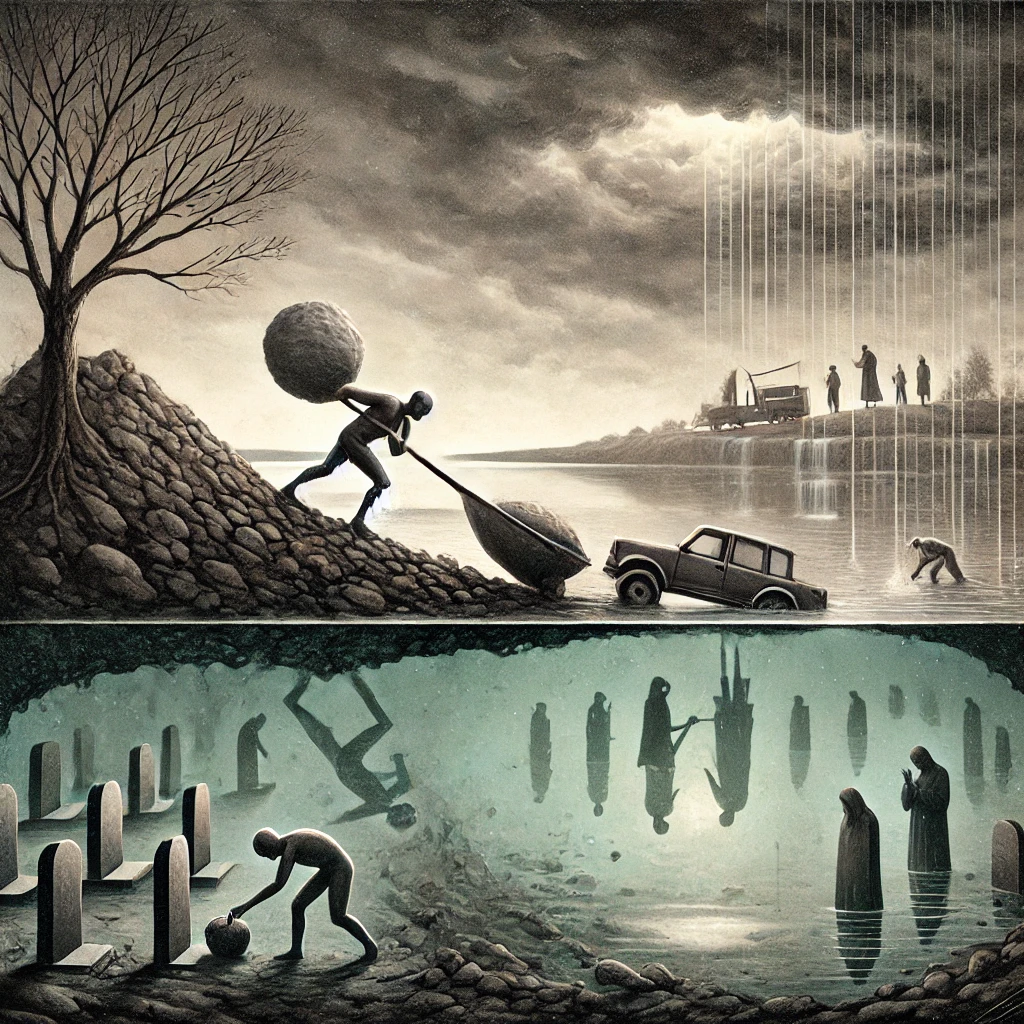 - Makna: Ini mengingatkan kita pada mitos Sisifus dari Yunani, yang dihukum untuk mendorong batu ke puncak bukit hanya agar batu itu menggelinding lagi ke bawah. Tindakan yang berulang dan tampak sia-sia. Tapi di sini, “menyerupai sesuatu” mungkin menunjuk pada perjuangan hidup manusia: keras, berat, sendirian—namun tetap dijalani, walau tahu mungkin tak akan sampai ke “tujuan” dalam arti harfiah.