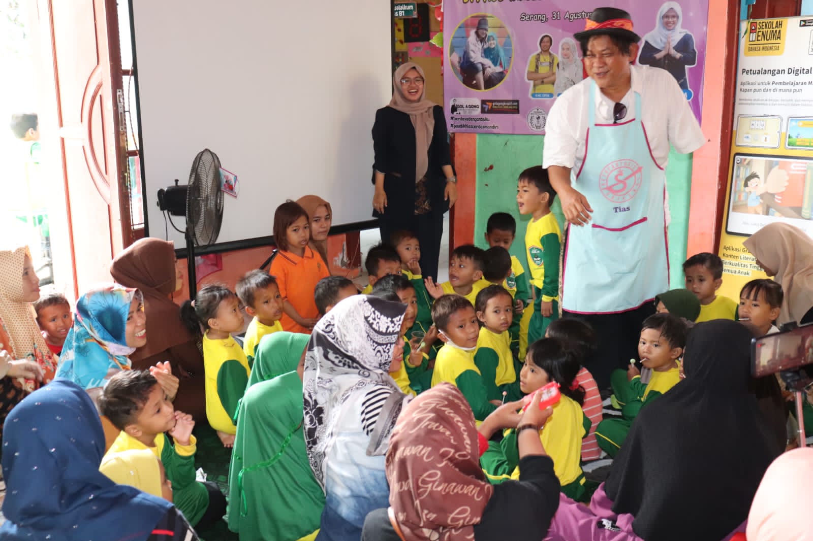 Sewaktu acara Sekolah Enuma Bahasa Indonesia di PAUD Ikhlas Cerdas Mandiri, Rawu, Kota Serang, Rabu 31 Agustus 2022, Paman Gong meminta saya celemek yang kantongnya bisa diisi permen dan coklat. Ini idenya tiba-tiba muncul begitu saja pas mau berangkat. “Mah, ada celemek nggak?” begitu tanyanya. Waah! Buat apa? Kenapa baru bilang sekarang? Ngedadak amat!
