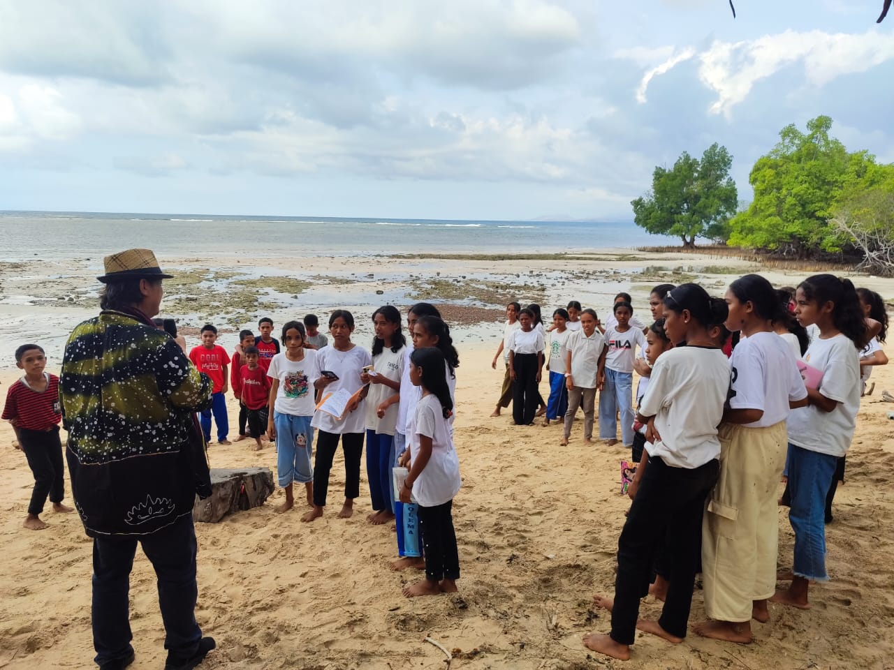 Duta Baca Indonesia, Gol A Gong berbagi pengalaman manfaat membaca kepada Komunitas Literasi SMPN Lewolema di Pantai Waimana, Larantuka, Flores Timur