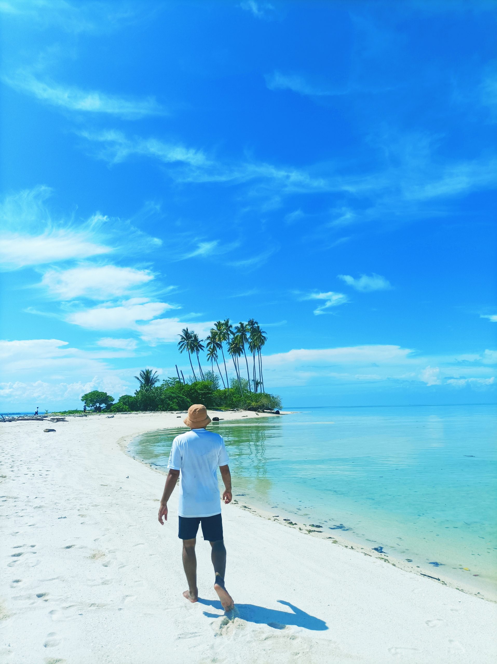 Pulau kecil ini dikelilingi oleh pasir putih, sementara di tengahnya tumbuh subur tanaman hijau dan beberapa pohon kelapa yang melambai-lambai diterpa angin