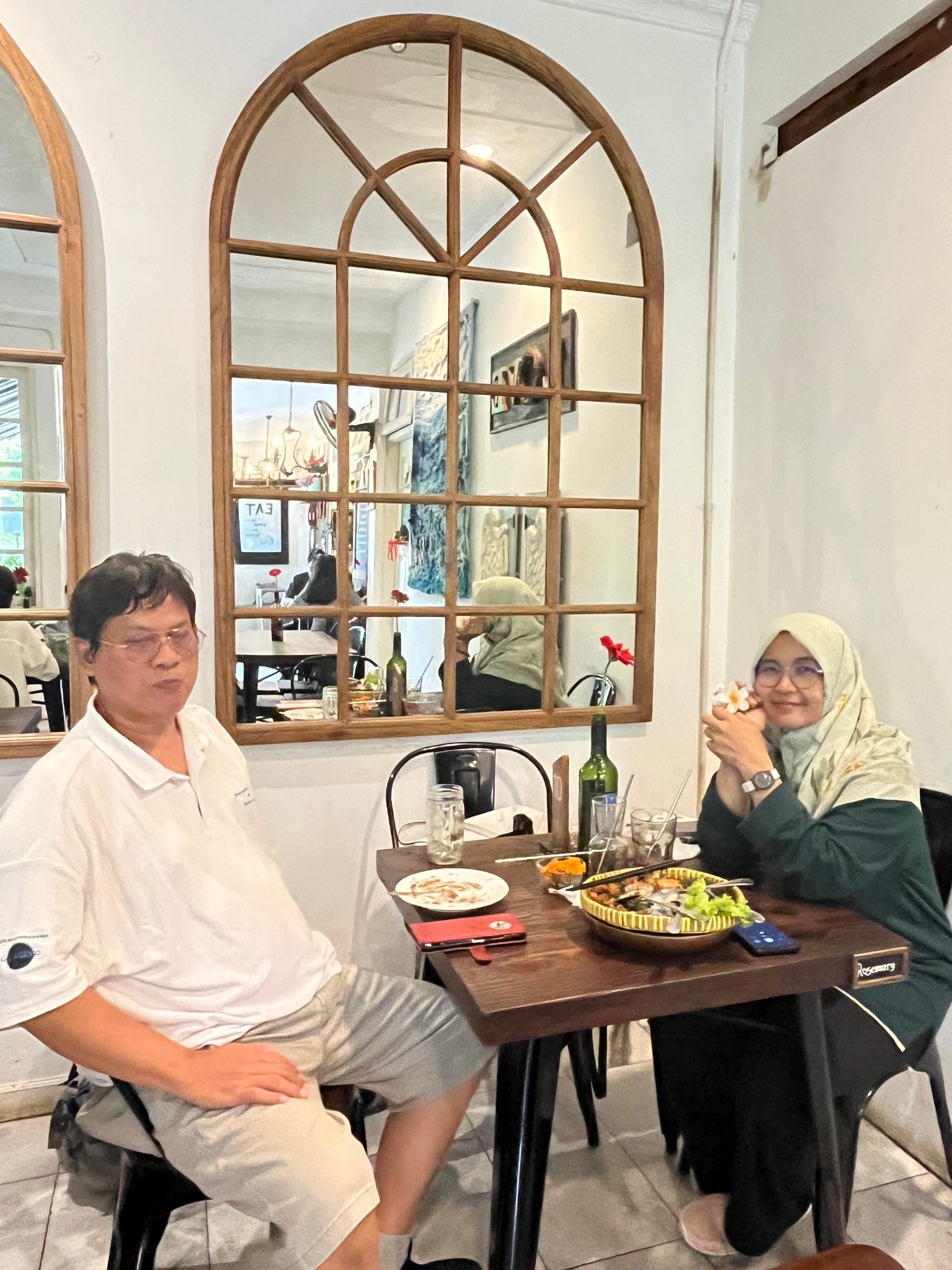 Putri pertama kami sudah menunggu di Mandiras Garden. Dia mengundang kami makan siang di sana. Di stasiun kami membeli minuman. Haus. Dua jam menahan dahaga di kereta.
