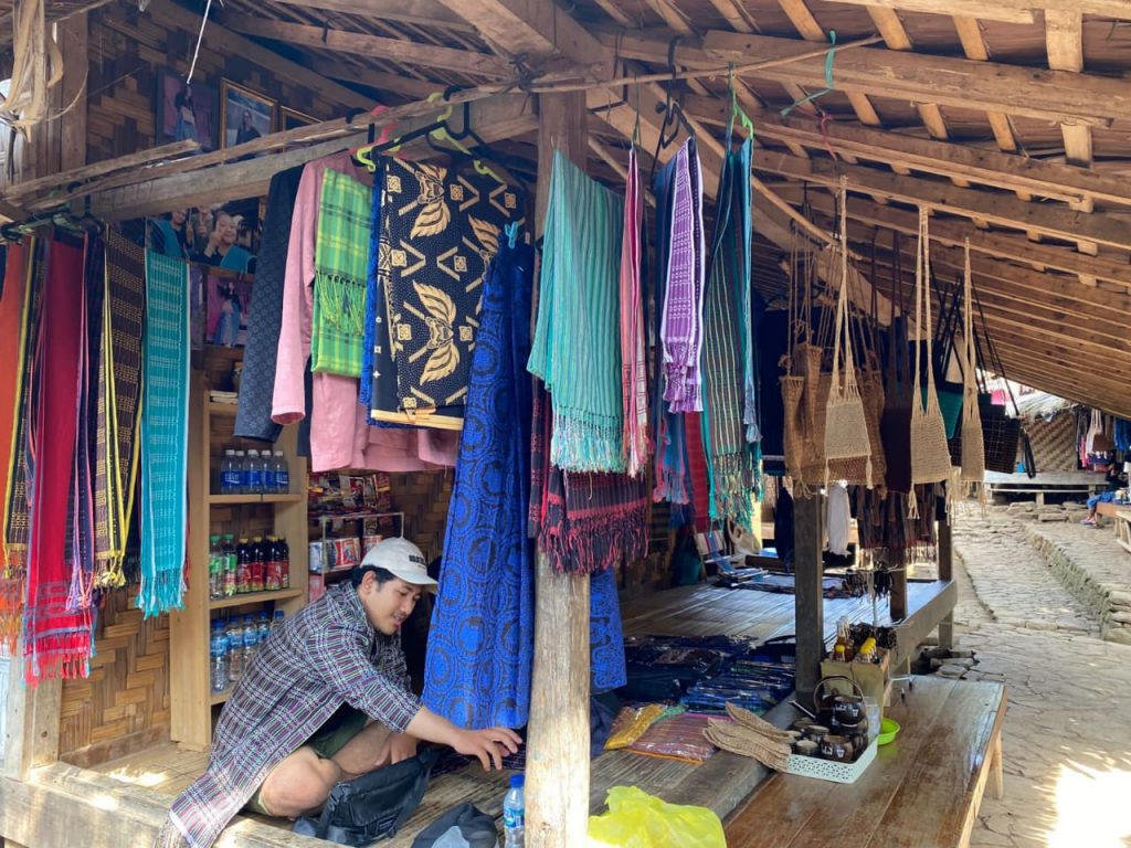 Diantara rumah panggung yang menjajakan kain tenun, aku terpesona dengan keindahan tenun motif suat songket yang dijual di rumah dengan papan nama “Dewi Baduy”.